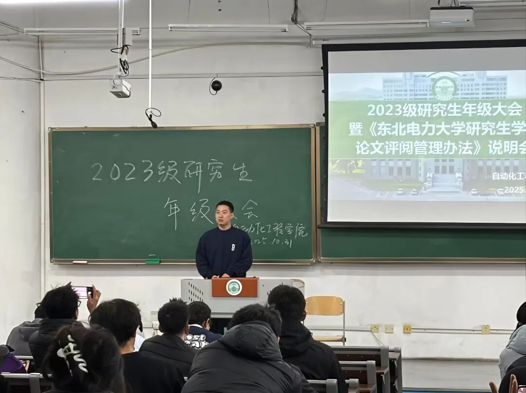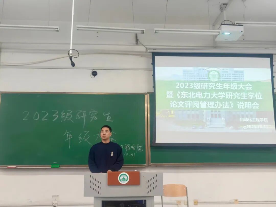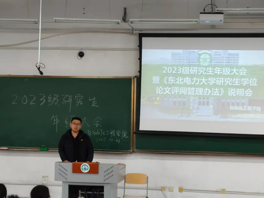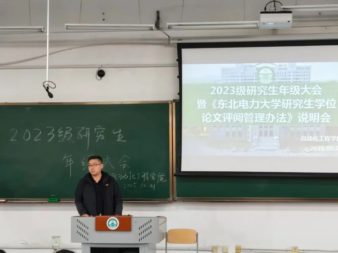 10月31日下午,自动化工程学院于东阶三合举行2026届研究生年级大会。本次会议围绕研究生现阶段就业工作总结和《东北电力大学研究生学位论文评审管理办法》解读展开,会议由研究生辅导员王英乾主持,学院副院长顾大可主讲,全体2026届研究生参加。
