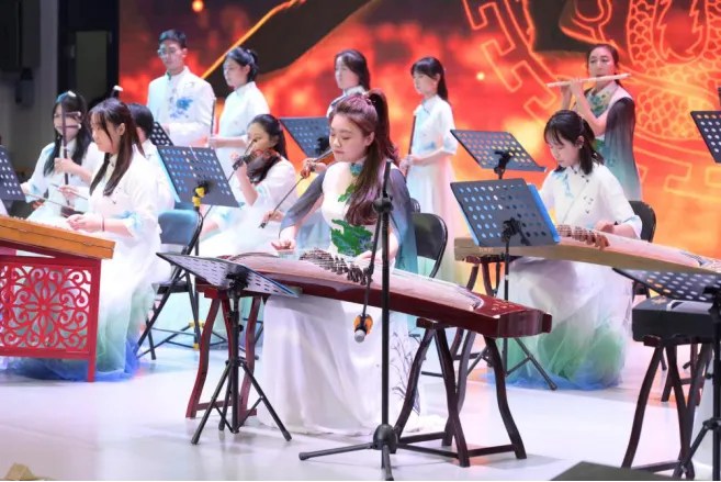 同心筑梦,族韵相融。经过两个月的紧张筹备,最终共有《吉临傣韵》《弦伴疆舞》《壮韵舞春漪》等 7 个节目进入了展演环节,其中由吉林市群众艺术馆与校民乐团合奏的《霍元甲》《飞驰天路》展现了中华民族自强不息、不畏强暴的民族气节和爱国精神。吉林市京剧传承保护中心李松瞳老师带来的《天女散花》京剧表演展现了中华民族崇善扬正的价值追求与兼容并蓄、博大精深的文化气度。展演现场气氛热烈,通过舞蹈、歌唱、器乐等多种艺术形式,以 “弦歌启章・九州同辉”“山河绘卷・地域之声”“文脉传承・民族之魂” 三个篇章全方位、多层次地展现了各民族独特的风采之美,生动呈现出一幅各民族多元一体,和而不同,交融共生,繁荣发展的绮丽画卷。