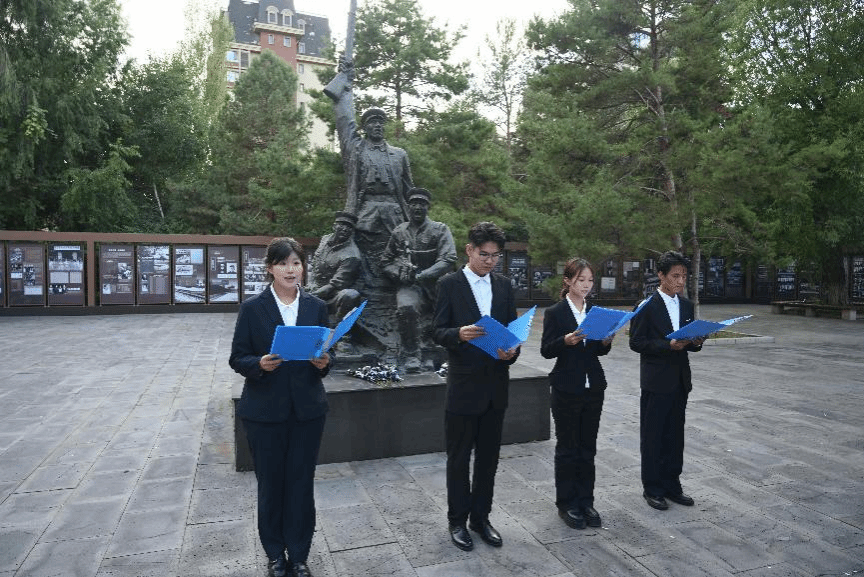 缅怀致敬英烈,赓续精神血脉。在长春南大营旧址陈列馆,团队认真观看历史实物、影像资料与场景复原,聆听抗日军民浴血奋战的感人事迹。四位成员朗诵《白山黑水间的不灭火种》,抒发对革命先烈的崇高敬意。全体成员整齐列队,向英烈鞠躬献花,面对党旗重温入党誓词,誓言铿锵,久久回荡。成员曹颖、高宇现场讲解南大营历史,使同学们深刻体悟抗联将士的英勇与坚韧,理解抗战精神在新时代的重要意义。